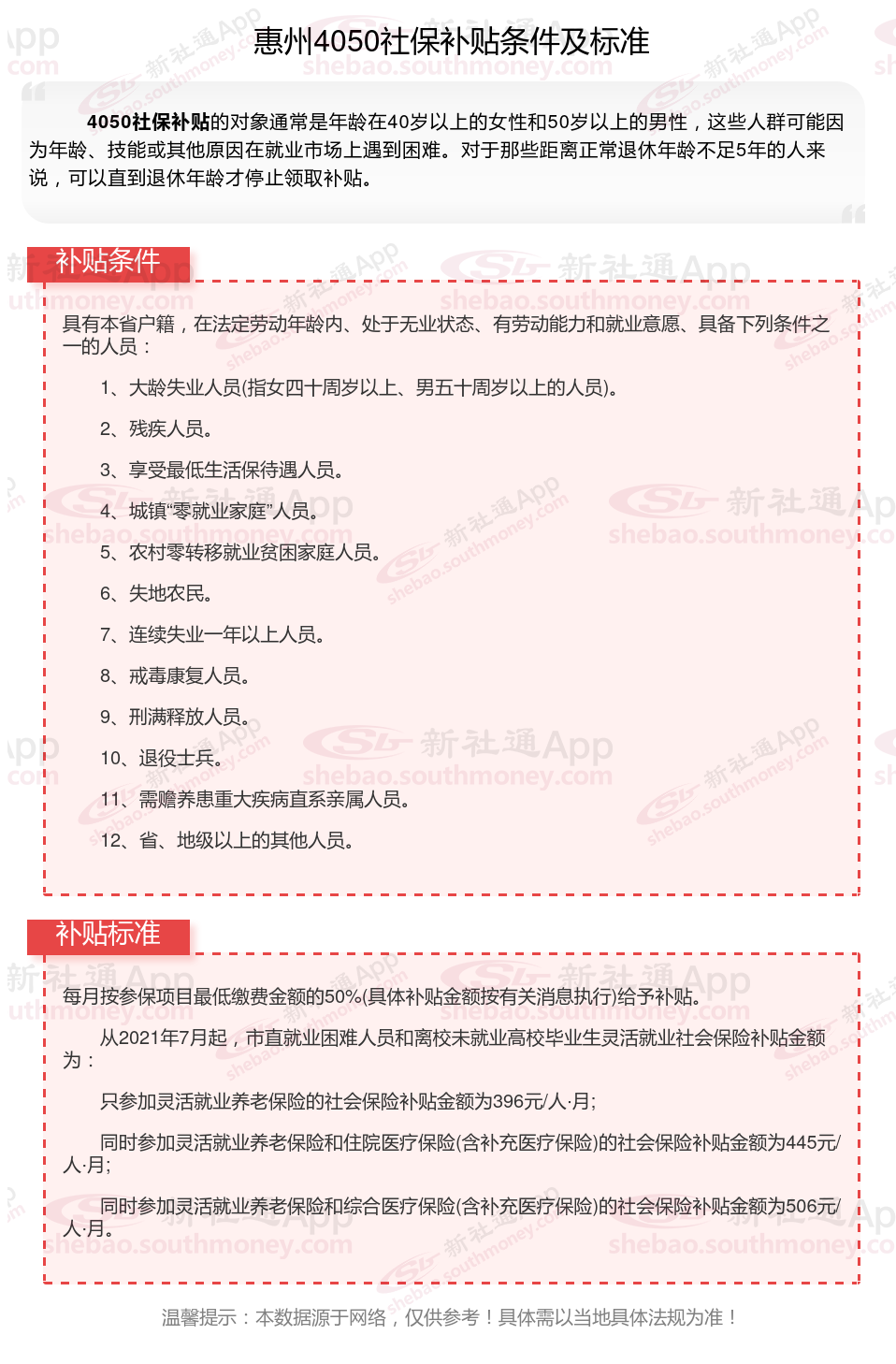 2024惠州4050补贴主要针对的是年龄在40岁以上的女性和50岁以上的男性,这些人群通常因为年龄较大而面临就业困难。