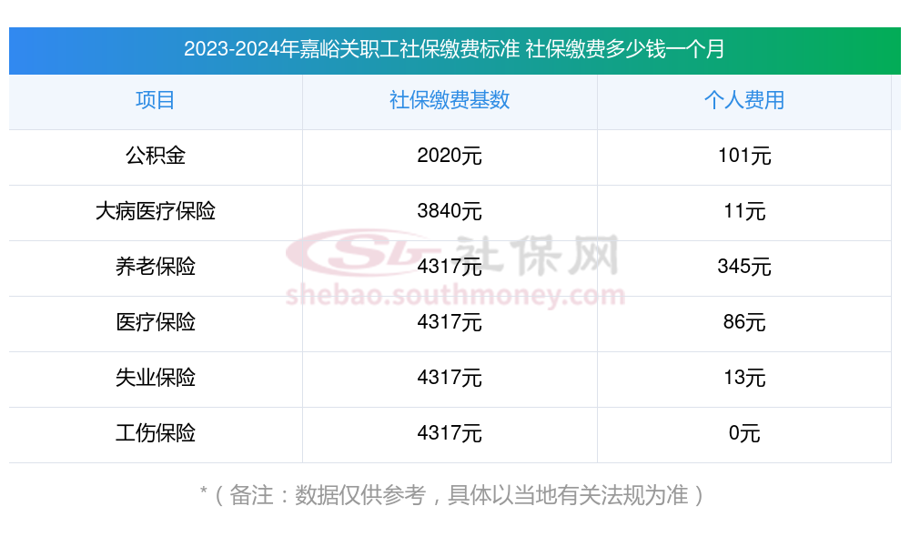 2024年嘉峪关社保缴费多少钱?下表是2023-2024年嘉峪关社保费用明细参考,新社通app-社保缴费查询工具提供的最新数据如下:
