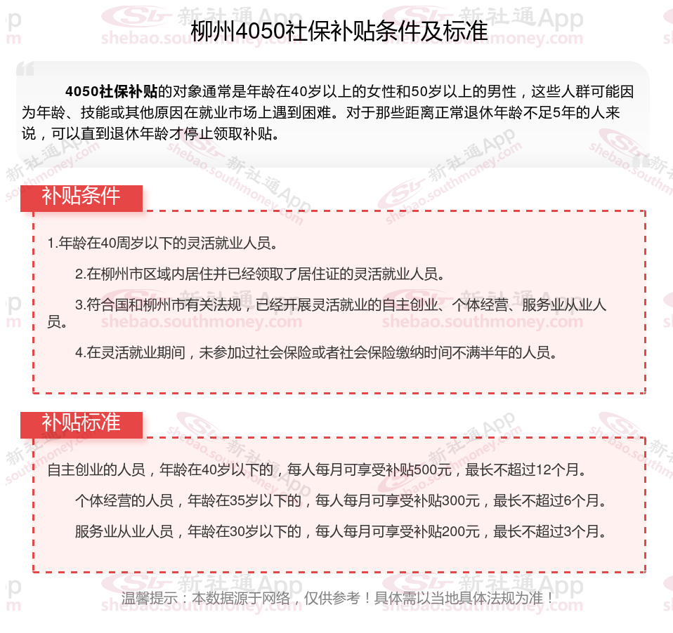 多数地区只有4050人员可以领取社保补贴,现在扩大了补贴对象及范围,通过就业困难人员认证,实现灵活就业,并且自己缴纳职工社保的灵活就业人员,一般都能申请灵活就业社保补贴。那么柳州4050灵活就业社保补贴标准是多少钱?柳州4050社保补贴条件是什么?接下来随新社通APP小编了解一下最新资讯。