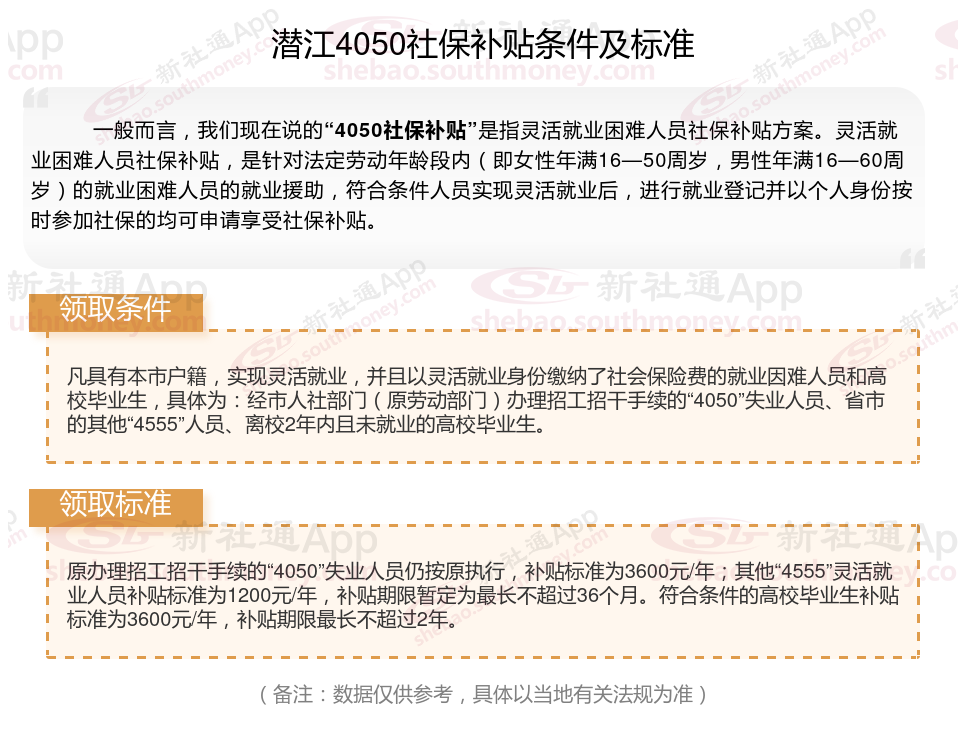 多数地区只有4050人员可以领取社保补贴,现在扩大了补贴对象及范围,通过就业困难人员认证,实现灵活就业,并且自己缴纳职工社保的灵活就业人员,一般都能申请灵活就业社保补贴。那么潜江4050灵活就业社保补贴标准是多少钱?潜江4050社保补贴条件是什么?接下来随新社通APP小编了解一下最新资讯。