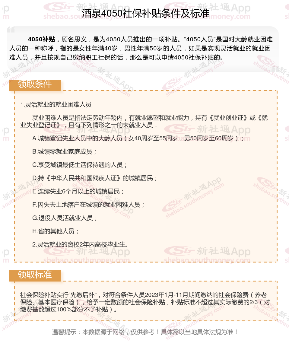 二、酒泉4050社保补贴标准及条件2023-2024年,最新如下