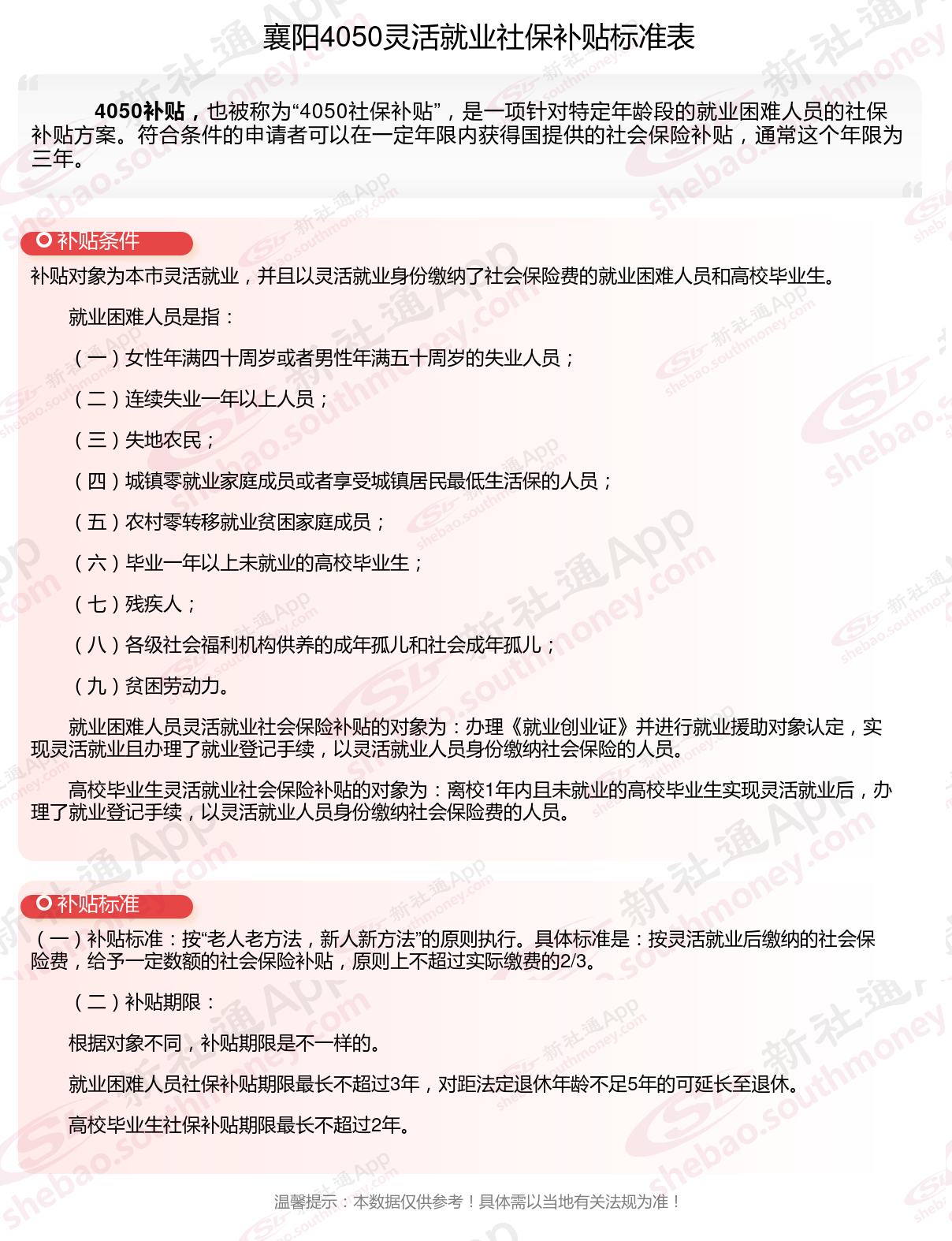 一、2023-2024年襄阳4050社保补贴标准及条件,最新如下