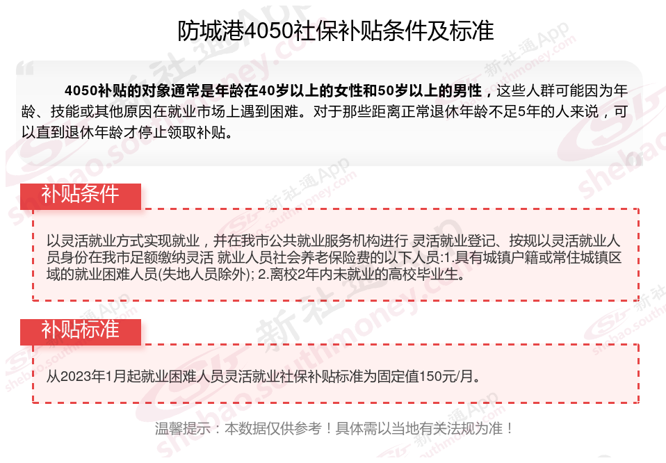 2024防城港灵活就业4050社保补贴是一项面向特定年龄段的就业困难人群的社会保险补贴。