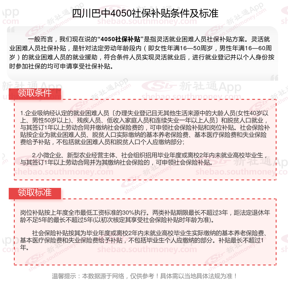 一、四川巴中4050社保补贴标准及条件2023-2024年
