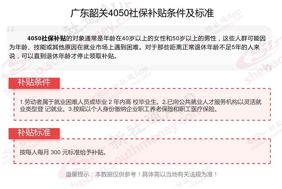 2024广东韶关4050补贴主要针对的是年龄在40岁以上的女性和50岁以上的男性,这些人群通常因为年龄较大而面临就业困难。