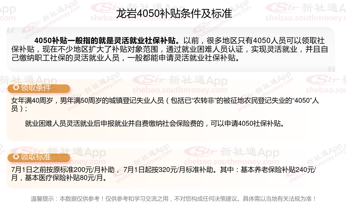 2024龙岩灵活就业4050社保补贴是一项面向特定年龄段的就业困难人群的社会保险补贴。