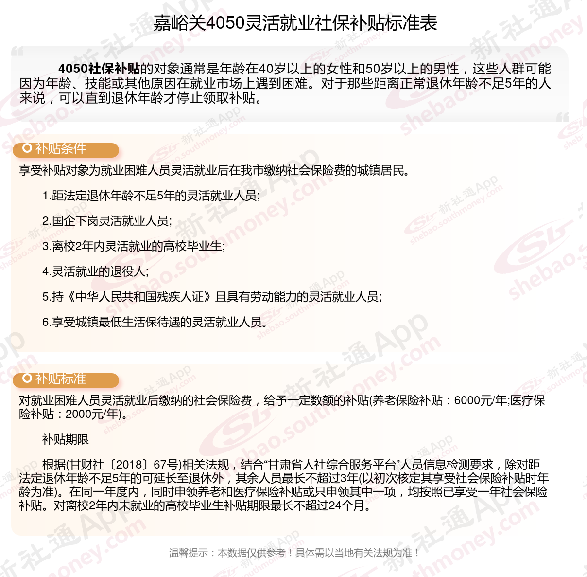 一、2023-2024年嘉峪关4050社保补贴标准及条件,最新如下