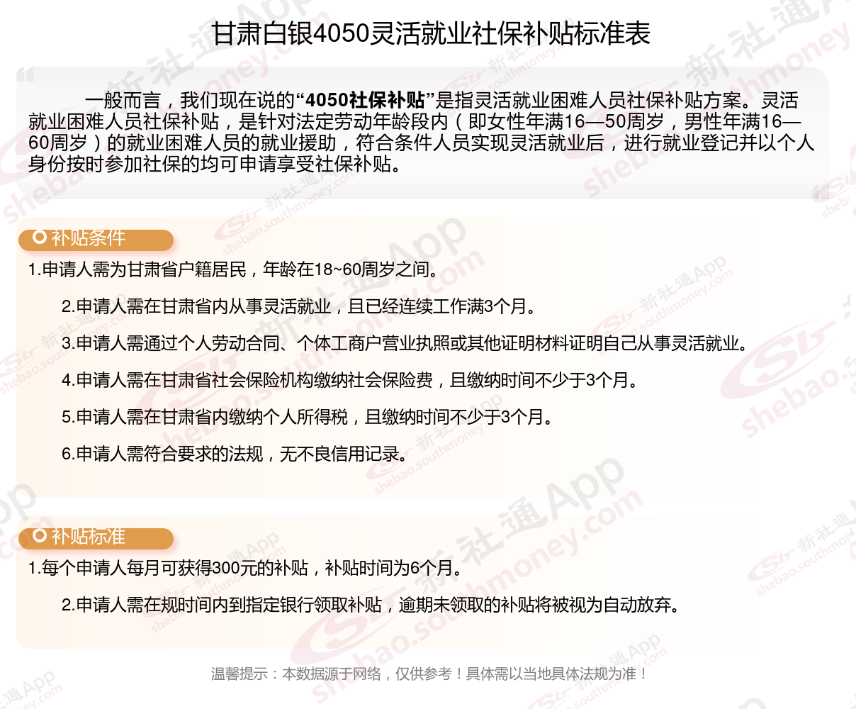 一、甘肃白银4050社保补贴标准及条件2023-2024年