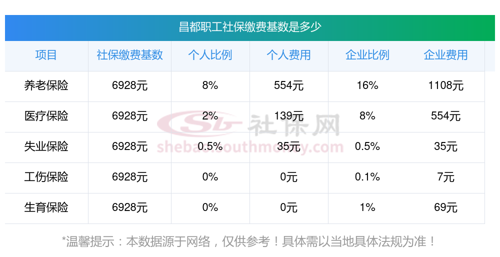 2024年昌都社保缴费多少钱?下表是2023-2024年昌都社保费用明细参考,根据新社通app-社保缴费查询工具提供的最新数据如下:
