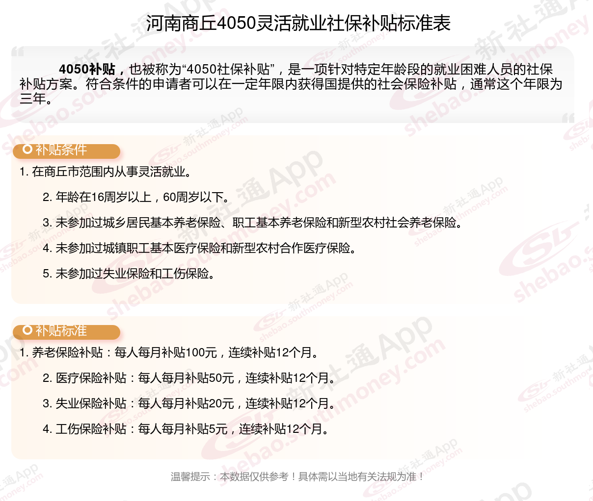一、河南商丘4050社保补贴标准及条件2023-2024年