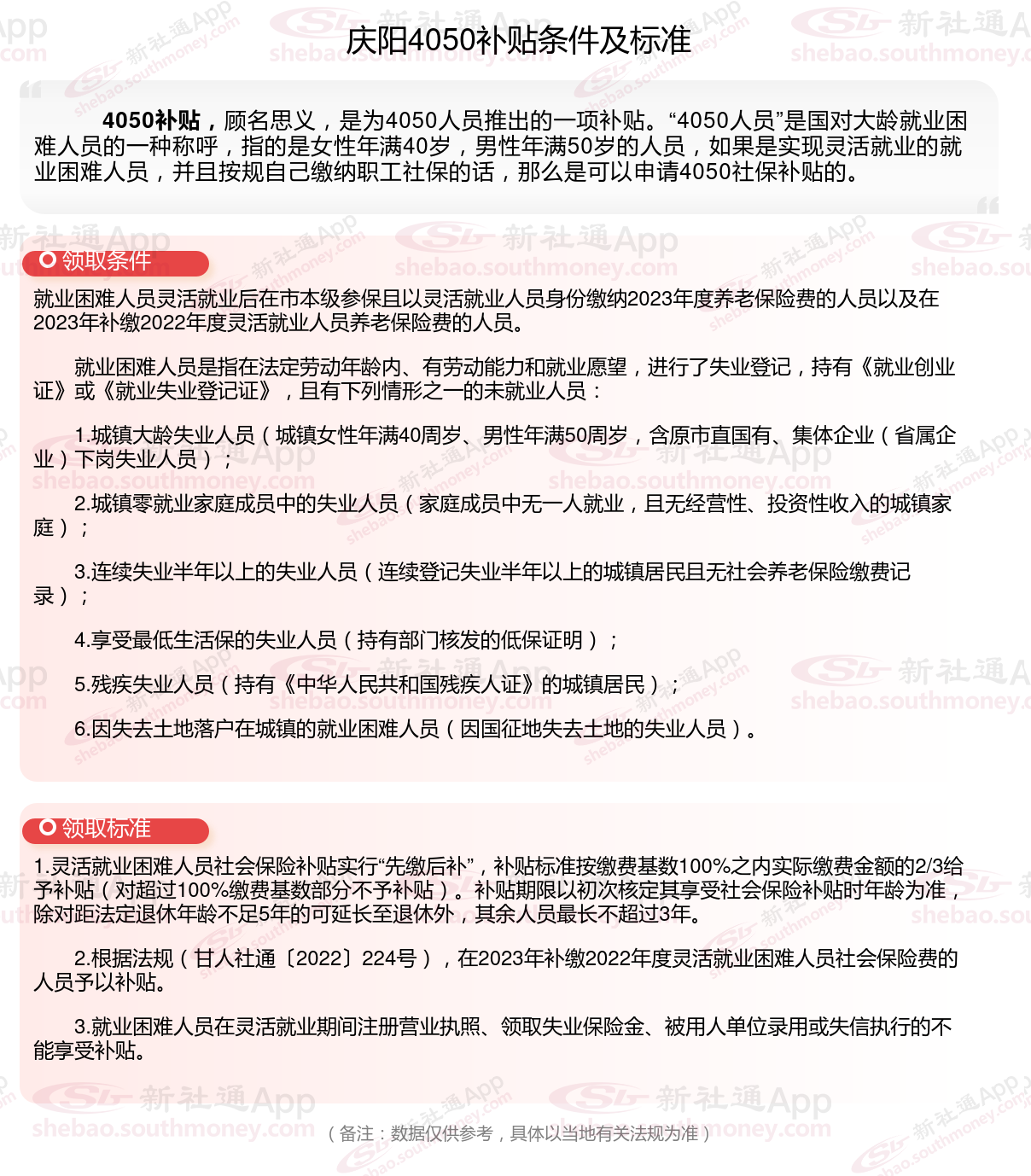 二、庆阳4050社保补贴标准及条件,最新如下: