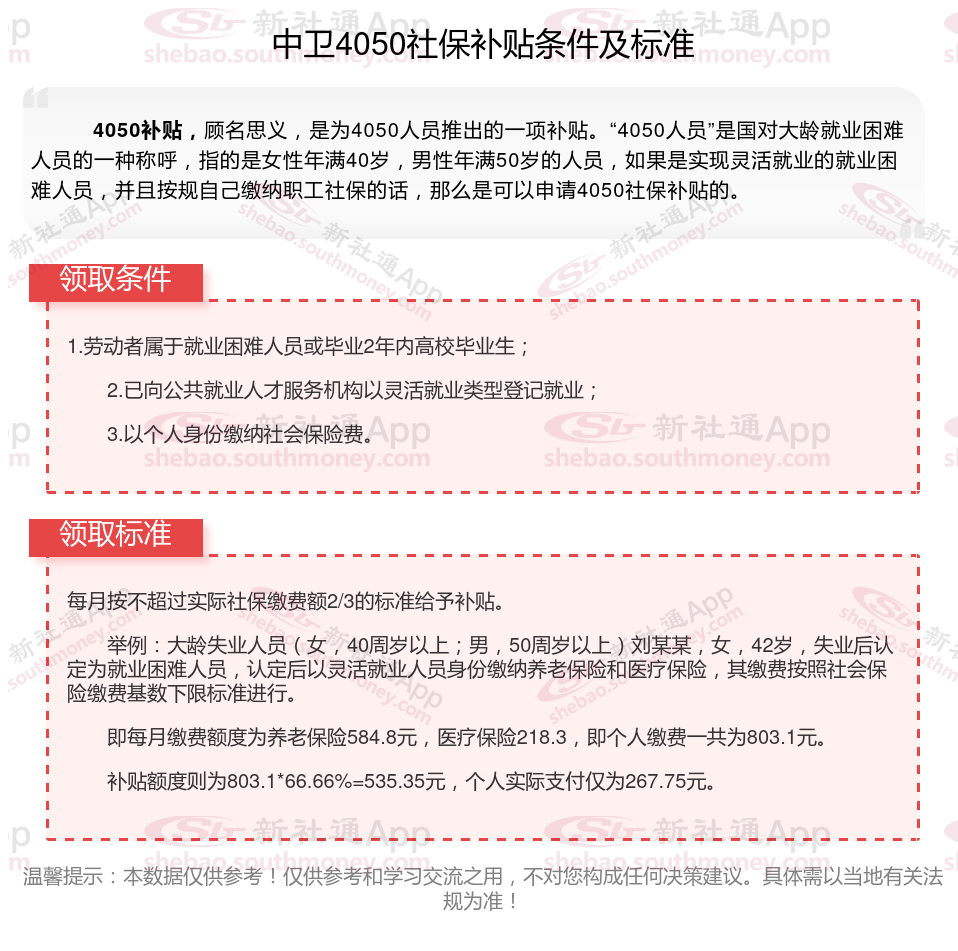 “灵活就业4050社保补贴”是指灵活就业困难人员社保补贴。该方案是对就业困难人员灵活就业后办理了就业登记手续并参加社会保险的,给予社会保险补贴。那么中卫4050灵活就业困难人员社保补贴标准是多少?中卫4050社保补贴需要符合什么条件?接下来随新社通APP小编了解一下最新资讯。