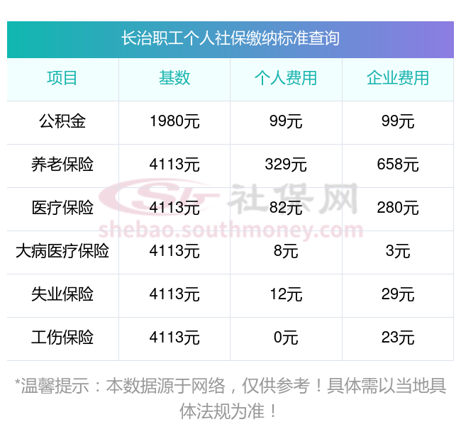 2024年长治社保缴费多少钱?下表是2023-2024年长治社保费用明细参考,新社通app-社保缴费查询工具提供的最新数据如下: