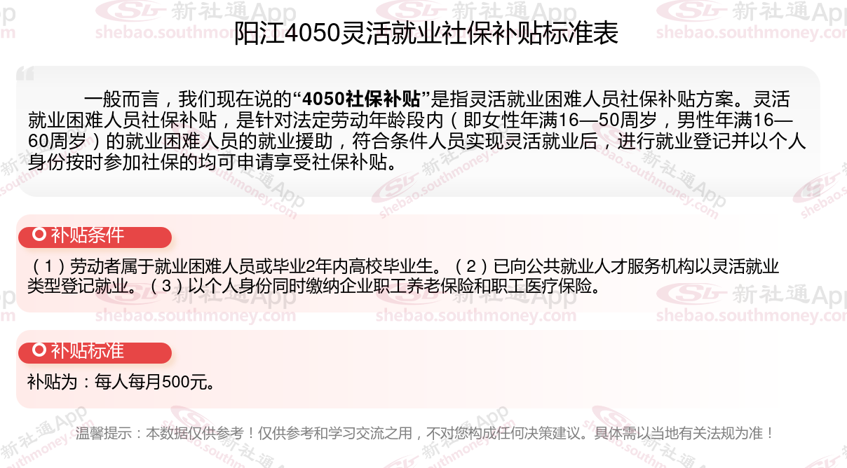 2024阳江4050补贴主要针对的是年龄在40岁以上的女性和50岁以上的男性,这些人群通常因为年龄较大而面临就业困难。