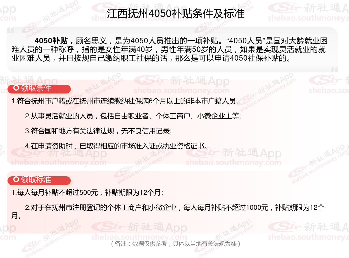 一、江西抚州4050社保补贴标准及条件2023-2024年