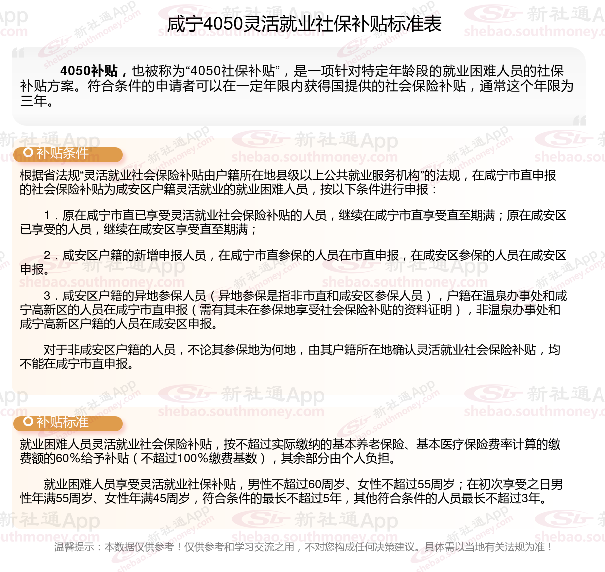2024咸宁4050补贴主要针对的是年龄在40岁以上的女性和50岁以上的男性,这些人群通常因为年龄较大而面临就业困难。