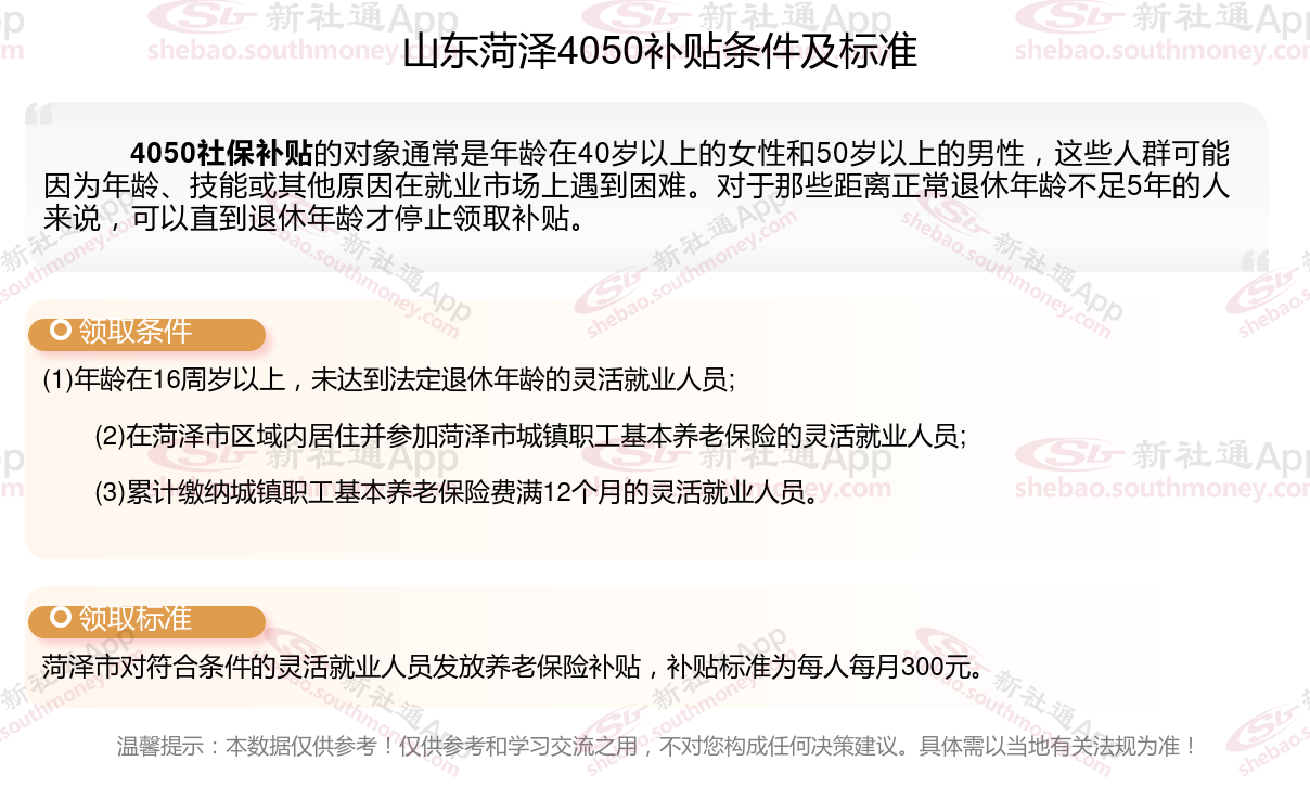 2024山东菏泽4050补贴主要针对的是年龄在40岁以上的女性和50岁以上的男性,这些人群通常因为年龄较大而面临就业困难。