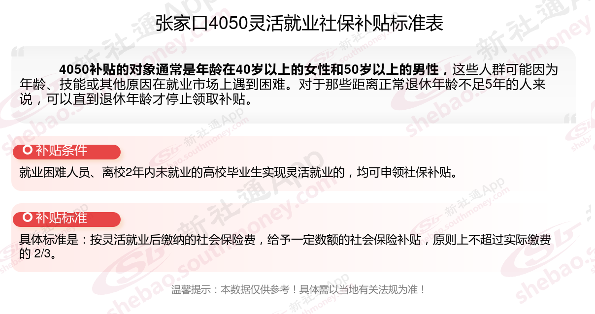 一、张家口4050社保补贴标准及条件2023-2024年