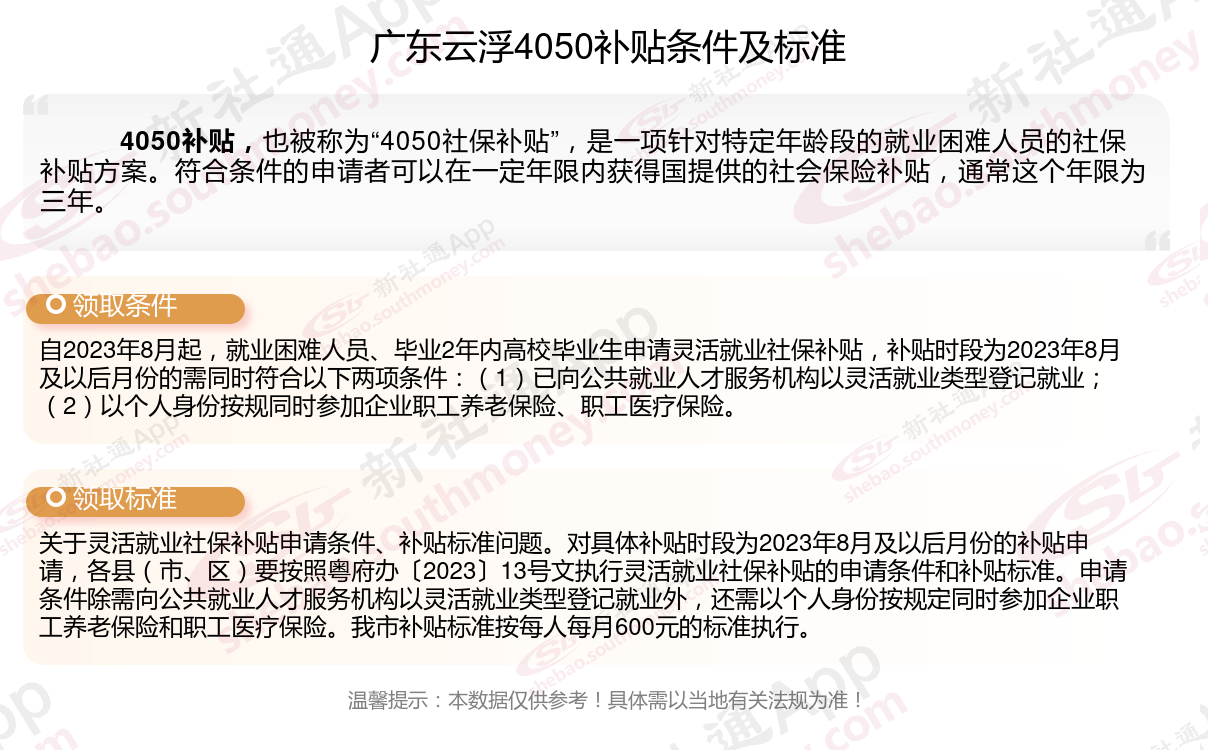 二、广东云浮4050社保补贴标准及条件,最新如下: