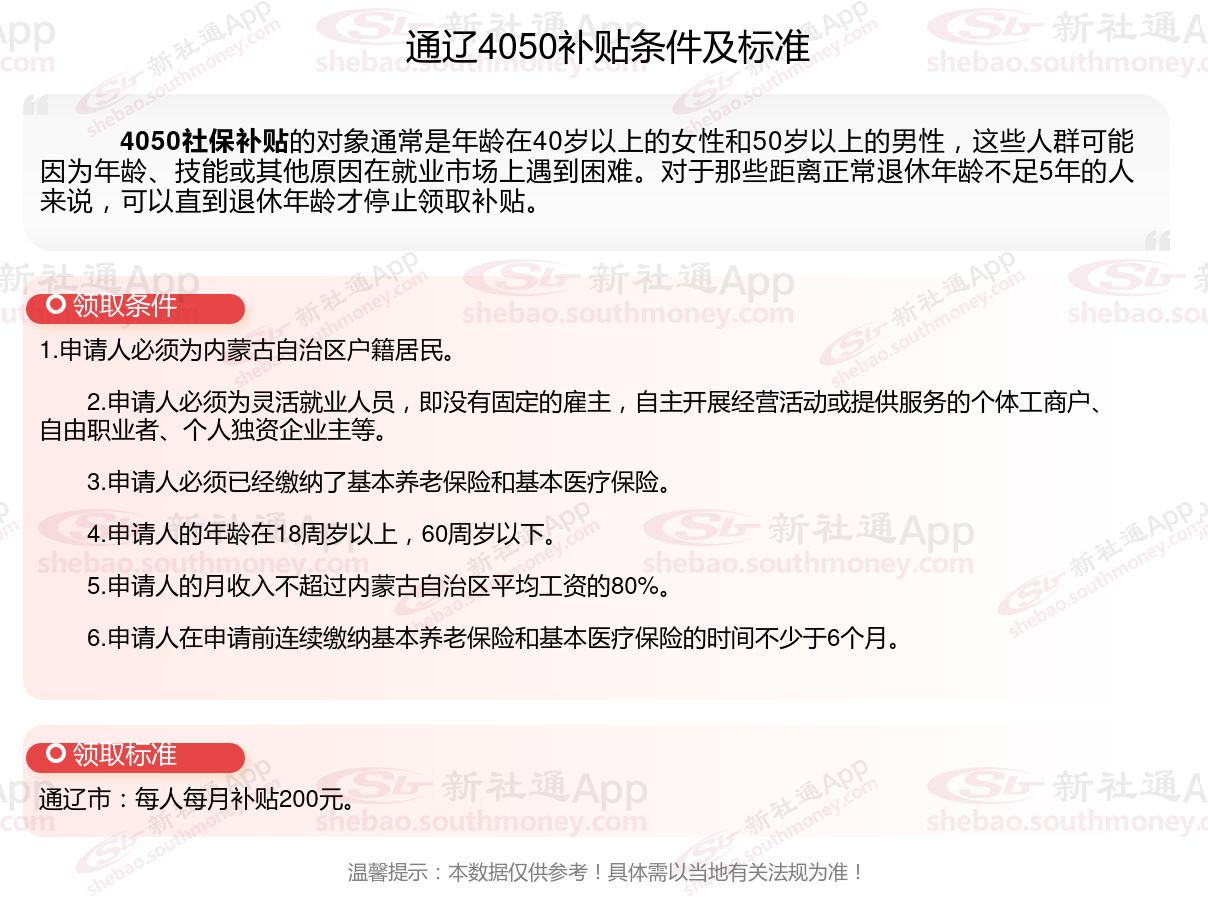“4050人员”是国对大龄就业困难人员的一种称呼,指的是女性年满40岁,男性年满50岁的人员,那么通辽4050灵活就业社保补贴标准是多少钱?通辽4050社保补贴条件是什么?接下来随新社通APP小编了解一下最新资讯。