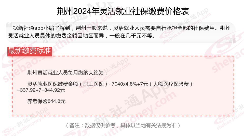 随着经济的发展和社会的进步,灵活就业人员越来越多,但是很多人不知道如何缴纳社保。本文将介绍2024年荆州灵活就业人员社保缴费基数及如何缴纳社保,能领取多少钱,帮助大家更好地了解灵活就业社保,随着新社通APP小编一起了解荆州灵活就业社保缴费最新资讯吧。