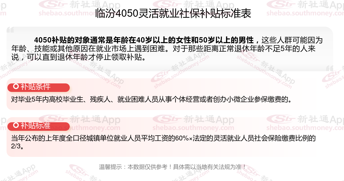 2024临汾4050补贴主要针对的是年龄在40岁以上的女性和50岁以上的男性,这些人群通常因为年龄较大而面临就业困难。