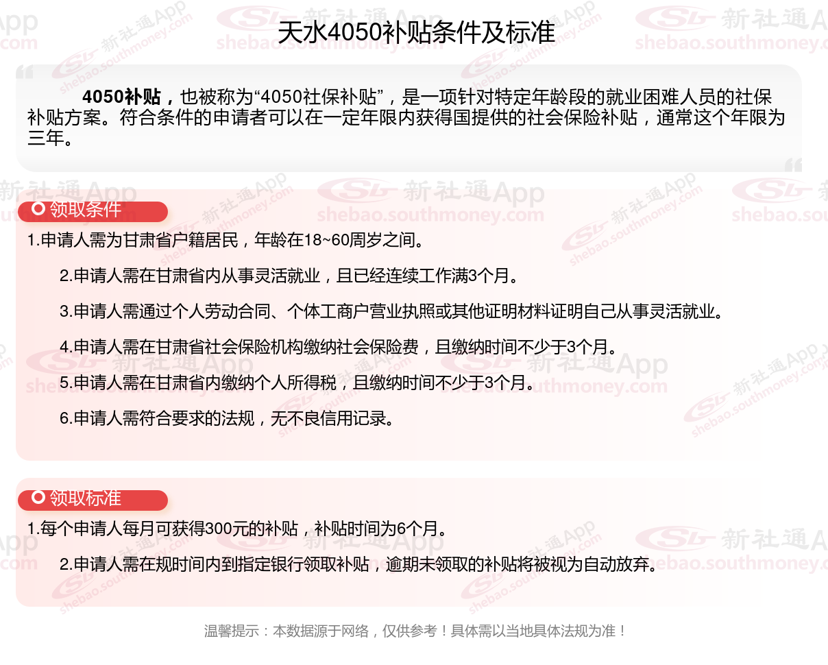 一、2023-2024年天水4050社保补贴标准及条件,最新如下