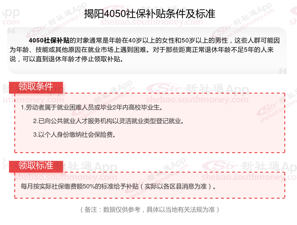 2024揭阳灵活就业4050社保补贴是一项面向特定年龄段的就业困难人群的社会保险补贴。