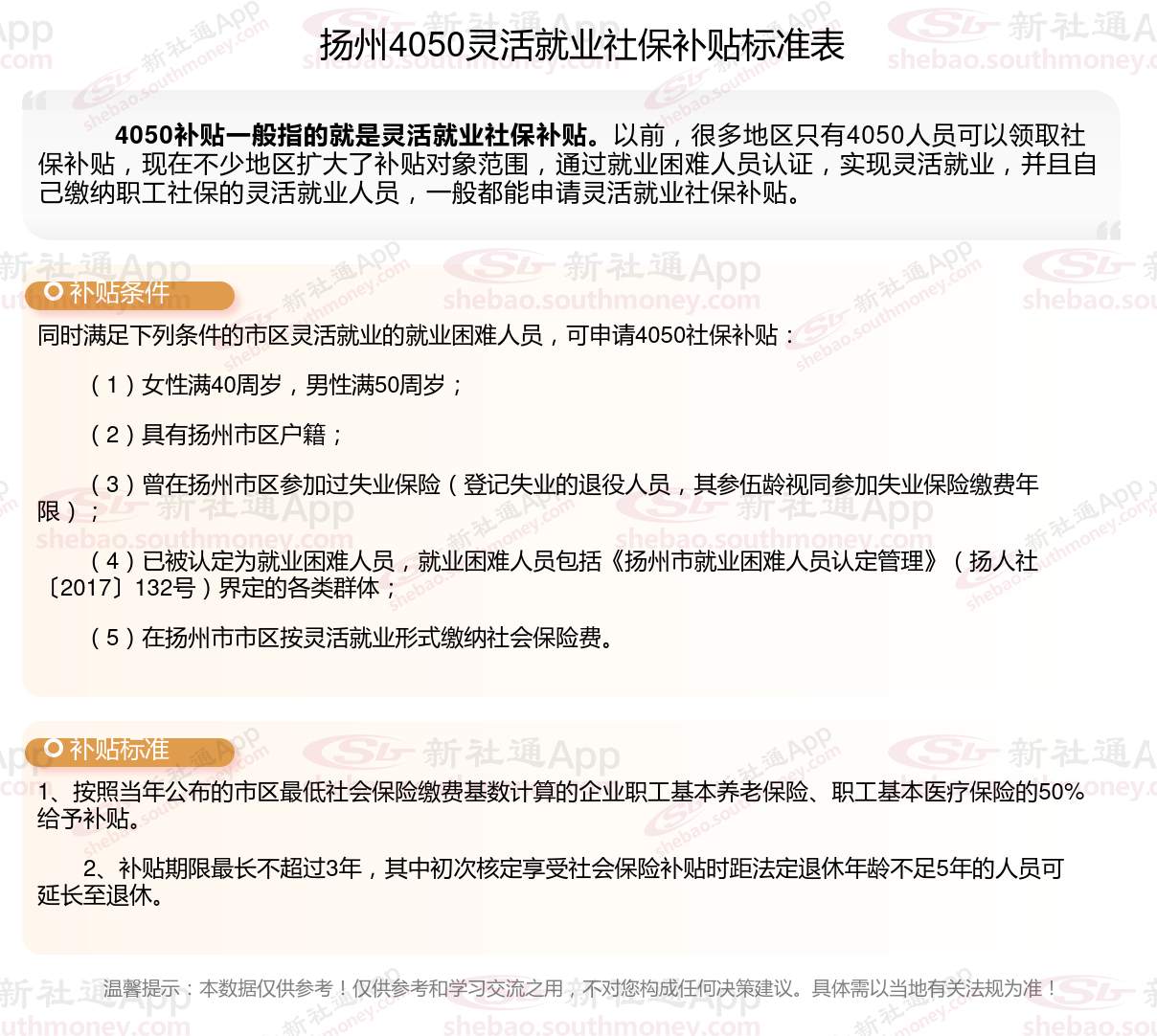 2024扬州灵活就业4050社保补贴是一项面向特定年龄段的就业困难人群的社会保险补贴。