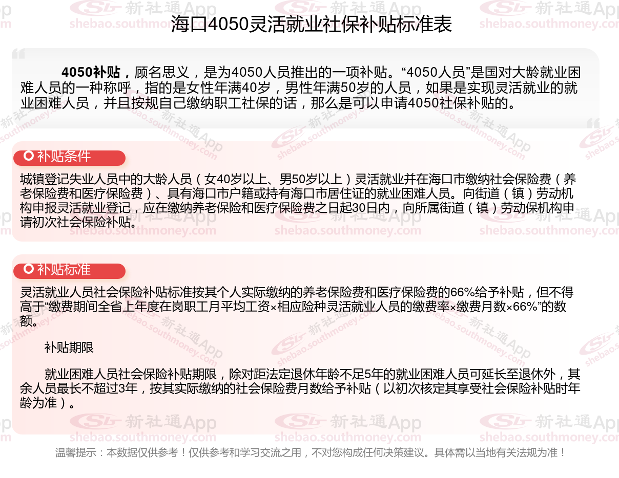 2024海口灵活就业4050社保补贴是一项面向特定年龄段的就业困难人群的社会保险补贴。
