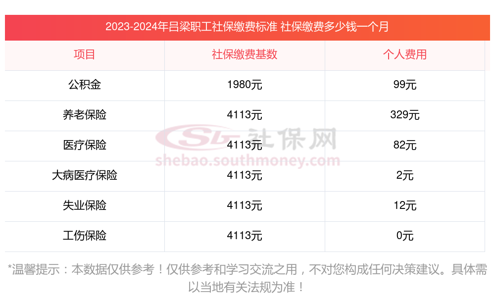 2024年吕梁社保缴费多少钱?下表是2023-2024年吕梁社保费用明细参考,新社通app-社保缴费查询工具提供的最新数据如下: