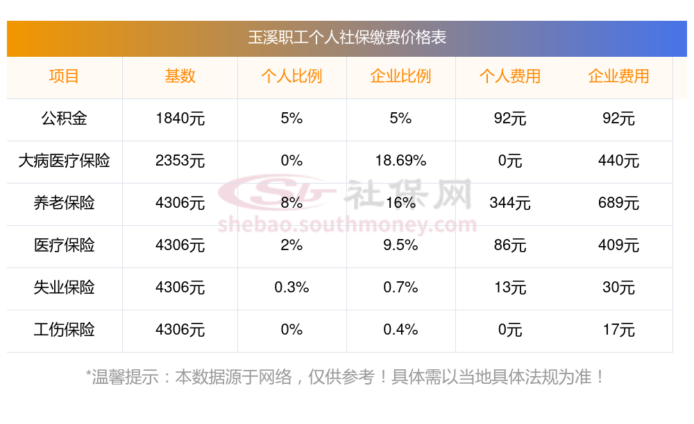 玉溪缴费社保比例一览 社保公司和个人各交多少?下表是2023-2024年玉溪社保费用明细参考,新社通app-社保缴费查询工具提供的最新数据如下: