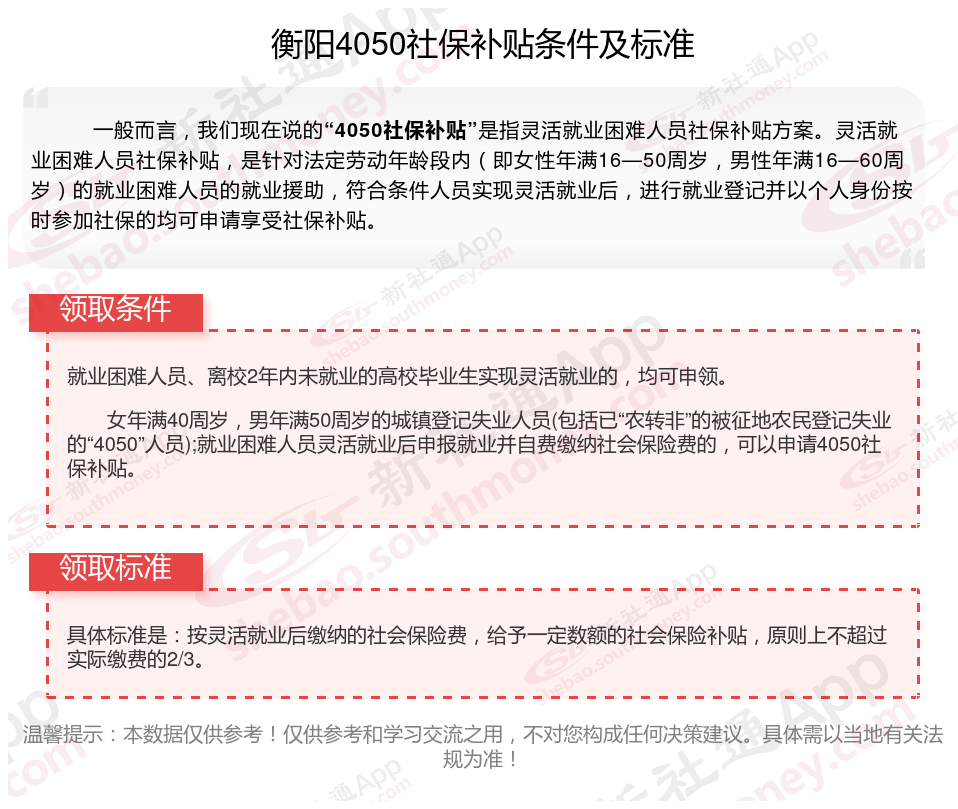 一、2023-2024年衡阳4050社保补贴标准及条件,最新如下