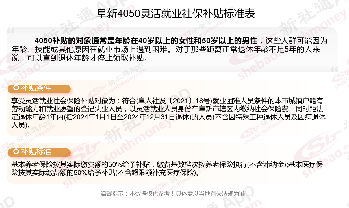 2024阜新灵活就业4050社保补贴是一项面向特定年龄段的就业困难人群的社会保险补贴。