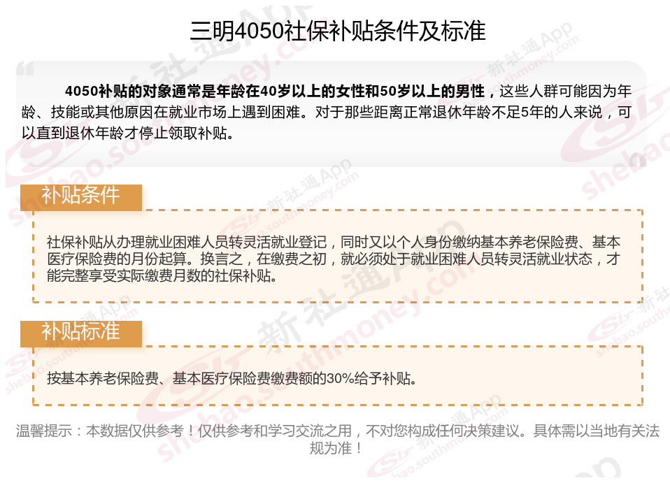 “4050人员”是国对大龄就业困难人员的一种称呼,指的是女性年满40岁,男性年满50岁的人员,那么三明4050灵活就业社保补贴标准是多少钱?三明4050社保补贴条件是什么?接下来随新社通APP小编了解一下最新资讯。