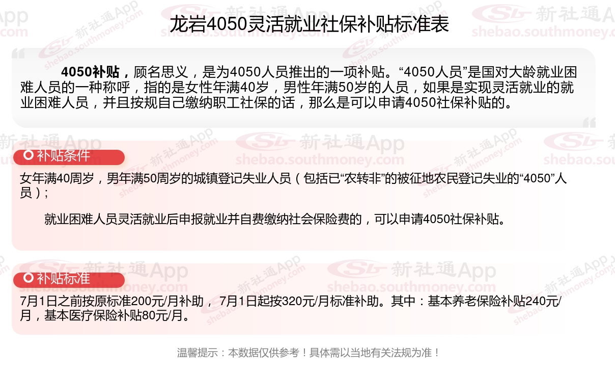 二、龙岩4050社保补贴标准及条件2023-2024年,最新如下