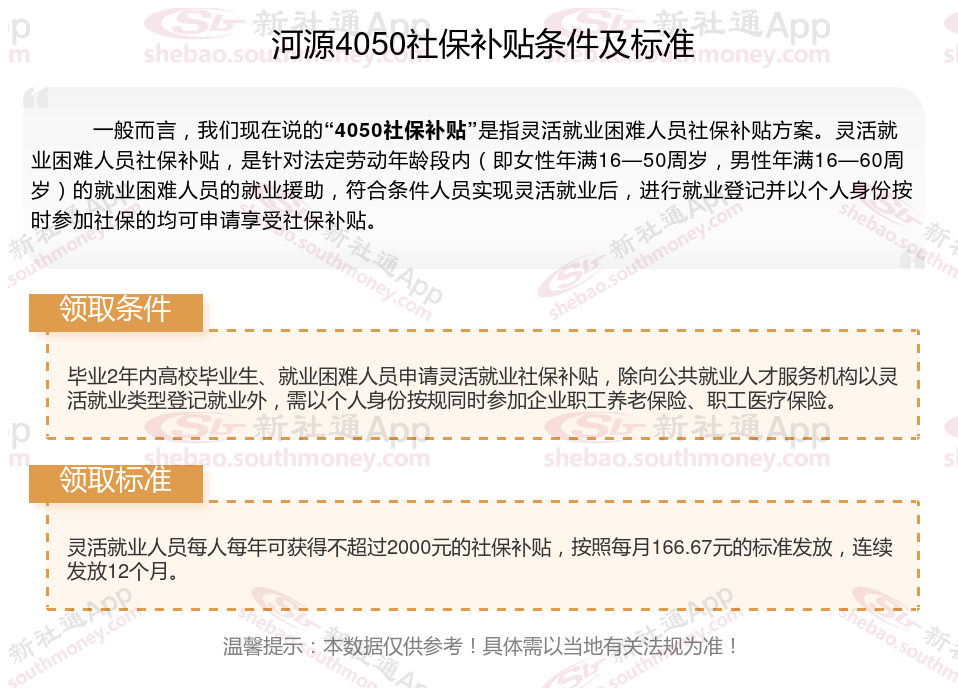 多数地区只有4050人员可以领取社保补贴,现在扩大了补贴对象及范围,通过就业困难人员认证,实现灵活就业,并且自己缴纳职工社保的灵活就业人员,一般都能申请灵活就业社保补贴。那么河源4050灵活就业社保补贴标准是多少钱?河源4050社保补贴条件是什么?接下来随新社通APP小编了解一下最新资讯。