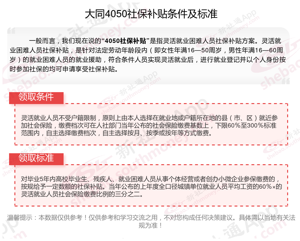 多数地区只有4050人员可以领取社保补贴,现在扩大了补贴对象及范围,通过就业困难人员认证,实现灵活就业,并且自己缴纳职工社保的灵活就业人员,一般都能申请灵活就业社保补贴。那么大同4050灵活就业社保补贴标准是多少钱?大同4050社保补贴条件是什么?接下来随新社通APP小编了解一下最新资讯。