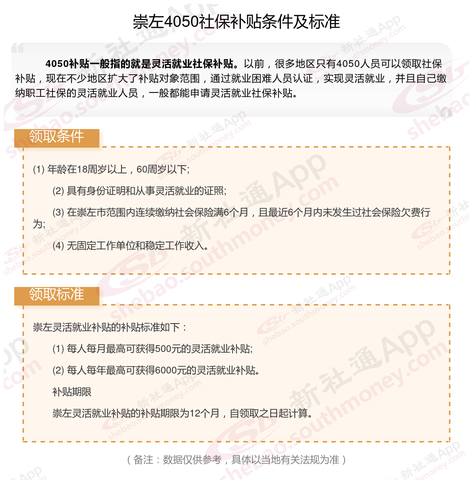 2024崇左灵活就业4050社保补贴是一项面向特定年龄段的就业困难人群的社会保险补贴。