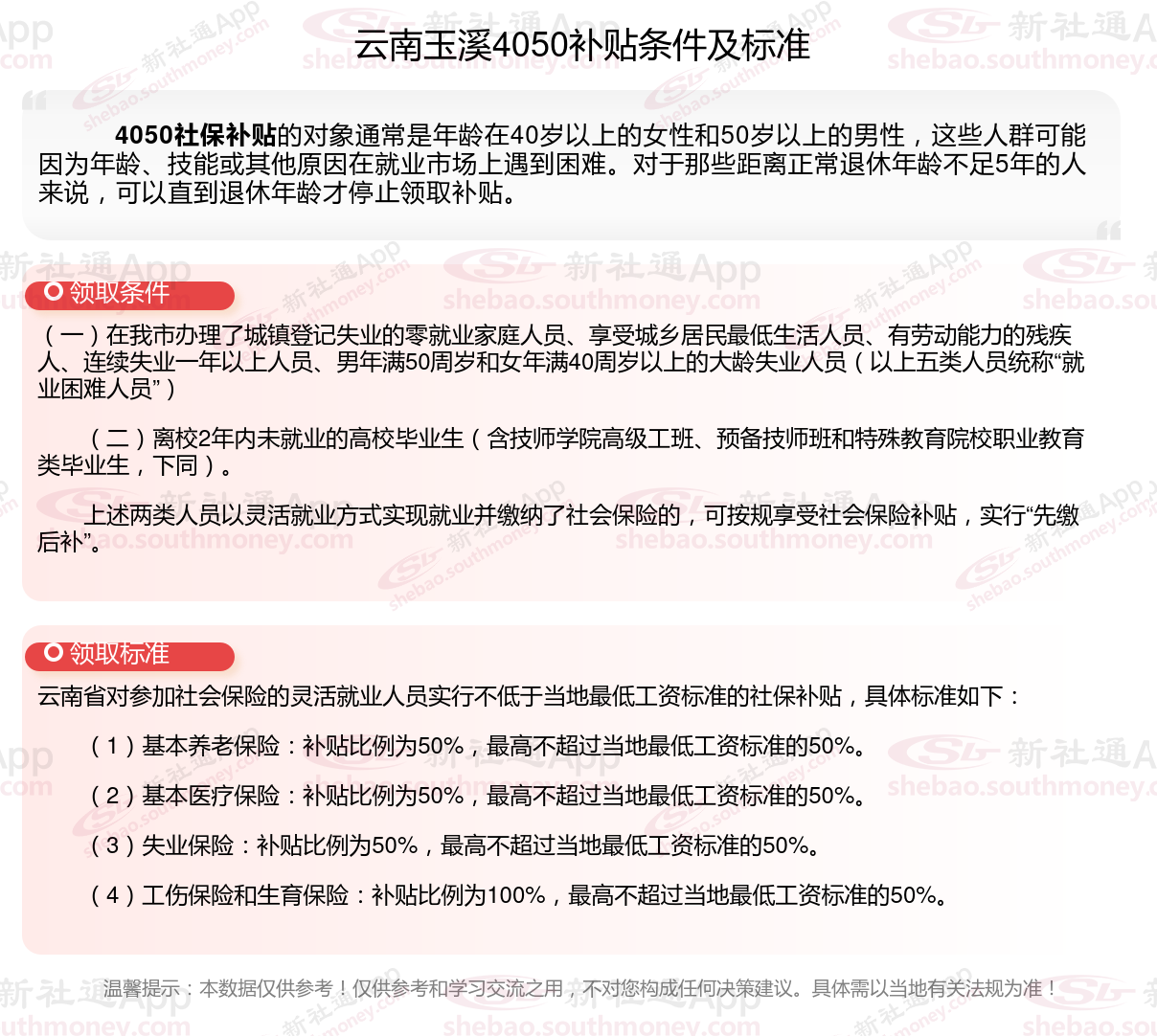 2024云南玉溪灵活就业4050社保补贴是一项面向特定年龄段的就业困难人群的社会保险补贴。