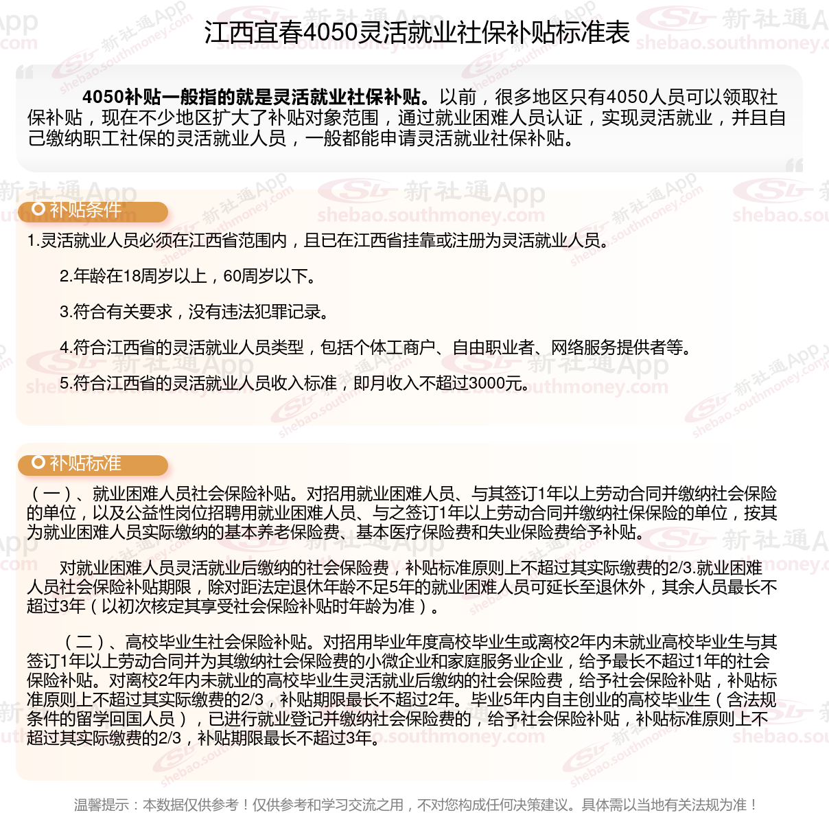 2024江西宜春灵活就业4050社保补贴是一项面向特定年龄段的就业困难人群的社会保险补贴。
