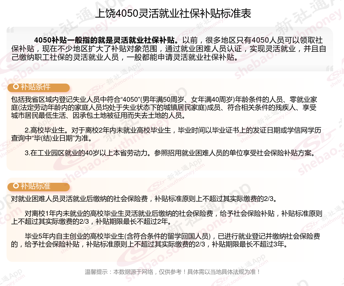 “4050人员”是国对大龄就业困难人员的一种称呼,指的是女性年满40岁,男性年满50岁的人员,那么上饶4050灵活就业社保补贴标准是多少钱?上饶4050社保补贴条件是什么?接下来随新社通APP小编了解一下最新资讯。