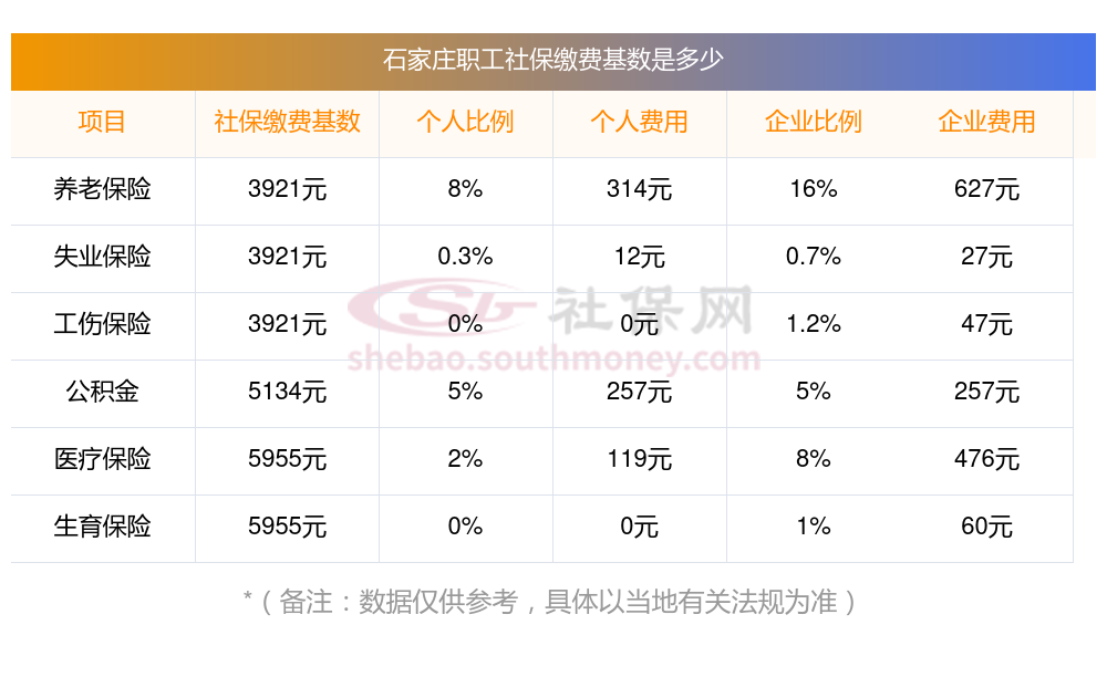 石家庄社保缴纳明细如下: