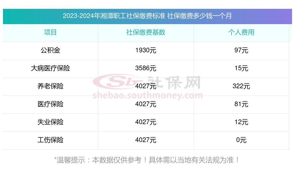 2024年湘潭社保缴费多少钱?下表是2023-2024年湘潭社保费用明细参考,新社通app-社保缴费查询工具提供的最新数据如下: