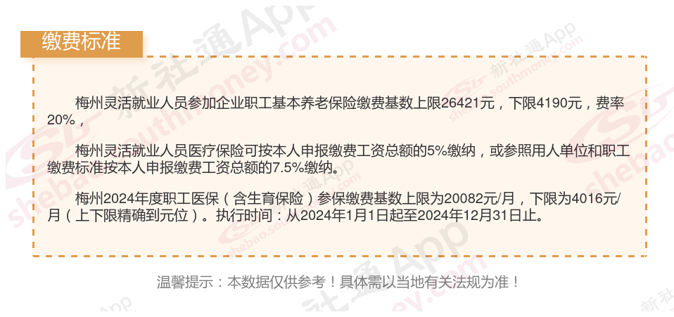 梅州2024年度职工医保(含生育保险)参保缴费基数上限为20082元/月,下限为4016元/月(上下限精确到元位)。执行时间:从2024年1月1日起至2024年12月31日止。