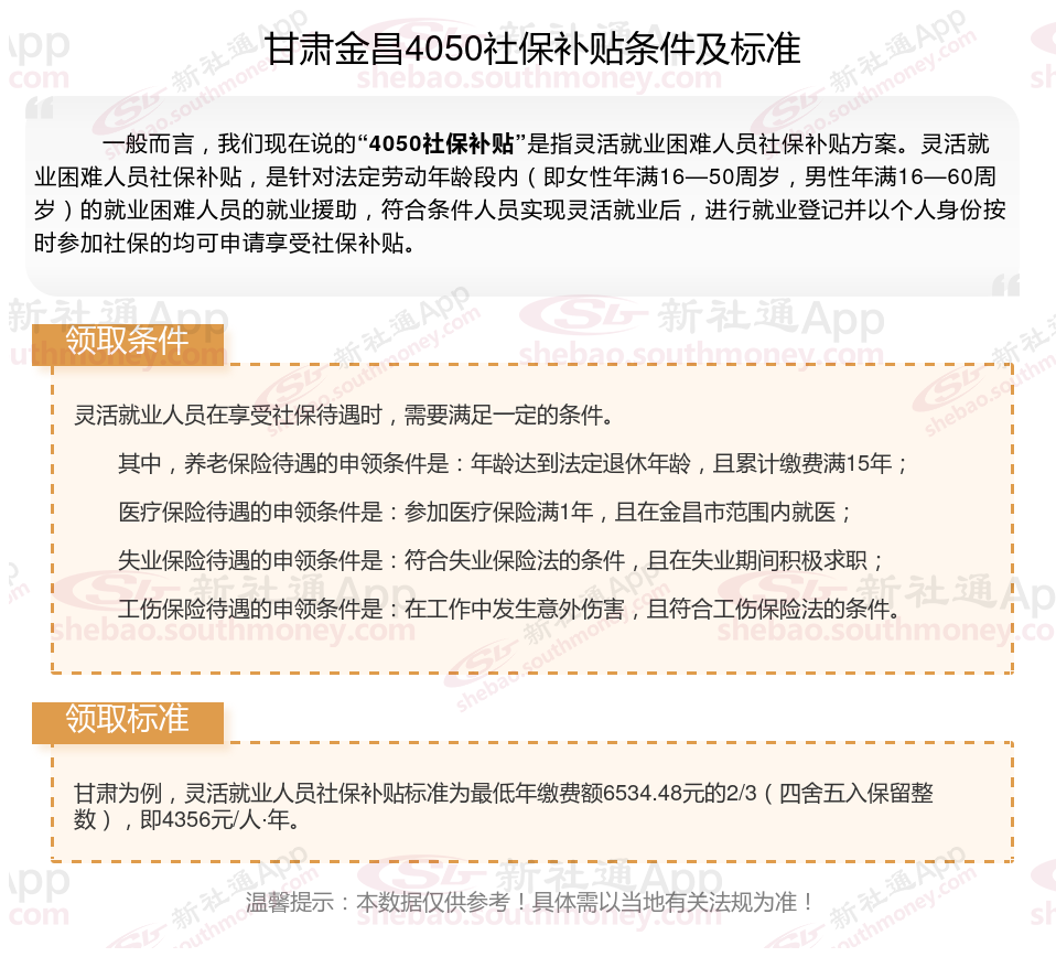 二、甘肃金昌4050社保补贴标准及条件2023-2024年,最新如下