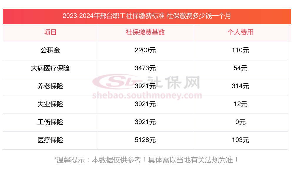 2024年邢台社保缴费多少钱?下表是2023-2024年邢台社保费用明细参考,如下: