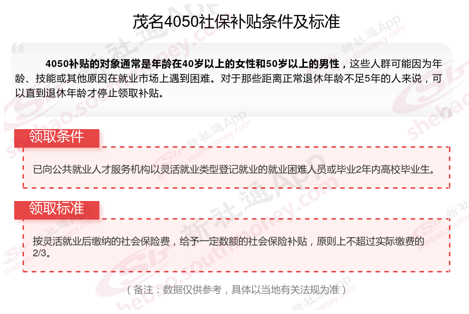 二、茂名4050社保补贴标准及条件2023-2024年,最新如下