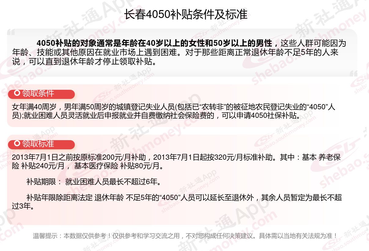 “4050人员”是国对大龄就业困难人员的一种称呼,指的是女性年满40岁,男性年满50岁的人员,那么长春4050灵活就业社保补贴标准是多少钱?长春4050社保补贴条件是什么?接下来随新社通APP小编了解一下最新资讯。