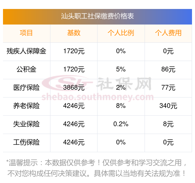 汕头缴费社保比例一览 社保公司和个人各交多少?下表是2023-2024年汕头社保费用明细参考,新社通app-社保缴费查询工具提供的最新数据如下:
